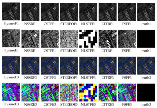 Figure 4 shows the fusion results of the compared methods on the Pavia University dataset. When there are more black pixels in the error image, the fusion result is better. It is evident from the figure that NLSTF has the worst fusion result, and the error image contains a large number of white spots. The STEREO fusion result is also unsatisfactory, and the error image contains many white pixel points. The main reason for the unsatisfactory fusion results of NLSTF and STEREO is that the downsampling factor influences the fusion effect of NLSTF and STEREO, and the larger the downsampling factor is, the worse the fusion effect is. The fusion quality of NSSR is usually closely related to the selection of endmembers, and the fusion quality of pixel points at the edges of endmembers is generally poor. Therefore, we can see that the error images of the fusion results obtained by the NSSR method also contain many noticeable white pixels. Among all the methods, only our proposed method, FSF, gives the best fusion results with the least number of white pixel points in the error image.