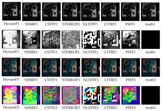 Table 4 corresponds to the quantitative metrics of the fusion results of the competing approaches on the CAVE dataset. In terms of the quantitative evaluation metrics of fusion, our method achieves similar or even slightly better fusion results than Hysure and CSTF methods. However, in terms of the time required for fusion, Hysure and CSTF required 239.961 s and 386.388 s, respectively, while our proposed FSF method required only 0.561 s. Thus, the time required was less than 0.2% of that for CSTF and less than 0.3% of that for Hysure. In addition to FSF, the shortest fusion time, STEREO, also required 25.213 s. Thus, FSF needed only 1/20 of STEREO, while the fusion effect was much better than STEREO.