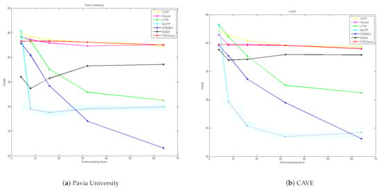 To fully demonstrate the timeliness and stability of our proposed method, we conduct comparative experiments in the following order. First, we conduct comparative experiments on the CAVE and Pavia University datasets to test the fusion effect and the excellent timeliness of our proposed method. Then, we test the fusion effects of the various fusion methods at downsampling factors of 4, 8, 16, 32, and 64 to verify the stability of our proposed method. Note that the downsampling factor is the number of pixel points per pixel point interval taken when simulating LR-HSI. For example, when the downsampling factor is 4, the size of the LR-HSI simulated from Pavia University data is 93 × 64 × 64, and when the downsampling factor is 16, the size of the corresponding LR-HSI is 93 × 16 × 16. The larger the downsampling factor is, the stronger the super-resolution capability of the fusion is. Here, we take the maximum downsampling factor to 64, i.e., to achieve a super-resolution of 64 times the spatial dimension, and the size of the LR-HSI involved in the fusion is only 93 × 4 × 4 at this time.