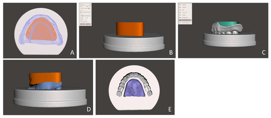 Figure 2. Design process for the primary geometry guide of the maxillary denture. (A) Selecting the region covering the metal base and artificial teeth on a base structure. (B) Extruding the selected area in a vertical direction. (C) Applying “Boolean Difference” command between the base structure and denture to eliminate the area occupied by the denture. (D) Discarding the upper structure after the command is performed. (E) Inspecting the primary geometry guide. - Modify the geometry guide design by discarding the labial, mesial, and distal surfaces of the teeth sockets (Figure 3). Export the STL file of the geometry guide.