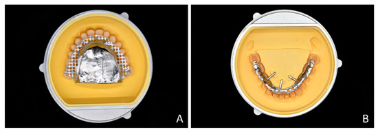 Figure 4. Artificial teeth and metal framework bonded to the geometry guide within the metal holder. (A) Maxillary structure. (B) Mandibular structure. - Pour autopolymerizing resin (Retec PRESS LT; Retec Kunststofftechnik GmbH, Rosbach, Germany) to fill the space above the geometry guide. Cure the resin using a dental polymerization unit (Palamat elite; Kulzer GmbH, Hanau, Germany) as per the manufacturer’s instructions;