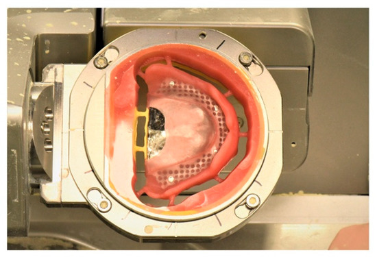 - Set the metal holder that contains the geometry guide, artificial teeth, and metal framework in the milling machine. Mill the denture according to the acquired modified denture data, in which the metal portion is extruded by 1 mm (Figure 5);