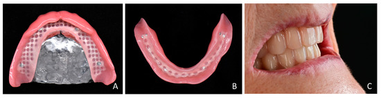 - Yoon, S.N.; Oh, K.C.; Lee, S.J.; Han, J.S.; Yoon, H.I. Tissue surface adaptation of CAD-CAM maxillary and mandibular complete denture bases manufactured by digital light processing: A clinical study. J. Prosthet. Dent. 2020, 124, 682–689. [Google Scholar] [CrossRef] [PubMed]