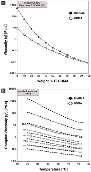 According to Darcy’s law, the viscosity affects the fluid flow behavior into a porous substrate. Lower viscosity is needed for ease of flow, while a higher viscosity affects infiltration rate and pressure. One group [9] used pure UDMA for their PICN material, which at 10 Pa·s, is several magnitudes greater than the 5:5 wt% BisGMA:TEGDMA (0.181 Pa·s), and UDMA:TEGDMA (0.090 Pa·s) commonly used by others. Monomer formulations greater than 10 Pa·s would be difficult for infiltration; therefore, with regard to viscosity, the formulations of BisGMA:TEGDMA 9:1 and 8:2 would fall out of this range. Viscosity is significantly influenced by changes in temperature; Figure 2b shows complex viscosity with increasing temperature. Monomer formulations with viscosity less than 0.1 Pa·s were excluded from the temperature sweep. Temperature has such a pronounced effect on viscosity it is able to reduce viscosity by orders of magnitude. Therefore, most monomer formulations can reach low viscosities suitable for infiltration.