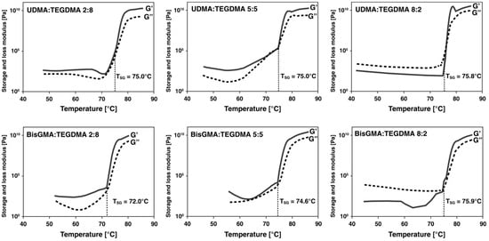 Increasing temperature allows for many monomer formulations to reach a lower viscosity threshold for infiltration; however, there is a maximum limit placed on the temperature. Using free radical polymerization with the use of an initiator, Figure 3 shows temperature-dependent behavior of different monomer formulations. A greater difference between G′′ and G′ showing strong interaction forces is seen in formulations (2:8) and (5:5) for both UDMA:TEGDMA and BisGMA:TEGDMA, as opposed to formulations (8:2) for both UDMA:TEGDMA and BisGMA:TEGDMA, both showing a higher loss modulus (G′′) over storage modulus (G′) indicating weaker unlinked molecules. This hypothesis is based on observations in Figure 3, not accounting for differences in the chain structure of BisGMA versus UDMA with a higher concentration of crosslinking double bonds in UDMA. Sol/gel transition temperature TSG lies between 72.0 and 75.9 °C for all formulations. All formulations with heat initiator BPO begin reactions around this temperature range. These values are in the range of temperatures selected for experimental PICN using BPO.