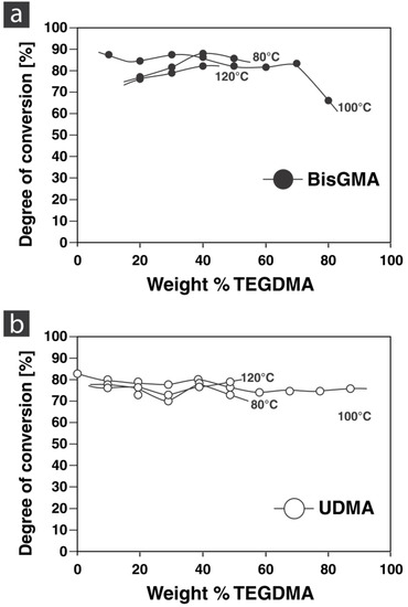 Degree of conversion of BisGMA:TEGDMA (a) and UDMA:TEGDMA (b) formulations.