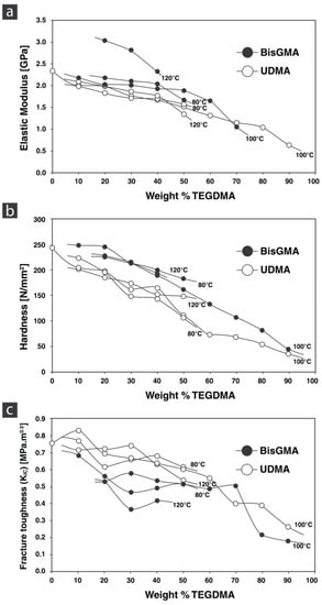 Figure 5a,b shows the elastic modulus and hardness of the monomer formulations cured at different temperatures and weight percentages of TEGDMA, respectively. There is a clear inverse correlation with the increase of TEGDMA in hardness, elastic modulus, and fracture toughness. The highest values for elastic modulus were seen in BisGMA:TEGDMA 8:2 (3.03 GPa) cured at 120 °C, and the lowest was UDMA:TEGDMA 1.9 (0.63 GPa) cured at 100 °C. The temperature did not affect UDMA:TEGDMA formulations. The highest hardness values were seen in the BisGMA:TEGDMA 9:1 formulation (249.07 ± 8.47 MPa), and the lowest in UDMA:TEGDMA 1:9 (33.81 ± 13.88 MPa). TEGDMA, with its low molecular weight, increases the flexibility of the polymer with an increase in weight ratio. This can be explained by the TEGMDA molecule’s ability to coil under load and rotate about its ether linkages [37].