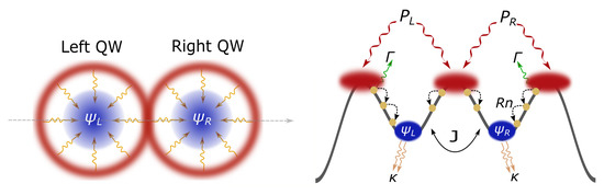 The system under consideration is schematically illustrated in Figure 1. One or more layers of semiconductor quantum wells are placed inside the semiconductor microcavity near the antinode of the resonant cavity field mode. Spatially shaped pumping lasers replenish continuously the exciton reservoirs and simultaneously create confining potentials for the polariton condensate. Assuming a tight-binding double-well potential, the exciton–polariton system can be described by the following coupled non-linear Schrödinger equations for the polariton condensate wavefunctions and in the left (L) and right (R) wells [30]: