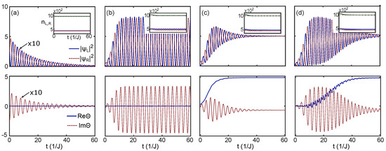 Hence, if initially , it will remain so at later times, . Then, the dynamics of the system, if pumped above threshold, will exhibit continuous Rabi-like oscillations with frequency J, while no steady-state will be attained, as in Figure 2b.