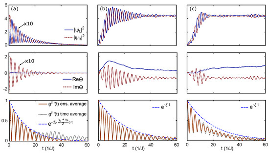 Dynamics of the polariton populations (upper panels), the coherence (middle panels), and the left-well polariton field correlation function (lower panels), for the same parameters as in Figure 2 with the addition of phase fluctuations causing decoherence with rate , as obtained from the ensemble averaged solution of Equations (1) and (2). (a) Linear case () with the below threshold pumping and leading to the exponential decay in the correlation function . (b) Same as in (a), but for stronger pumping above threshold and ; independently of the initial value of , the phase fluctuations cause an exponential decay in while the system approaches the steady state. (c) Same as in (b) but in the presence of nonlinearity , causing a slightly accelerated decay of with , and faster approach of the system to the steady state. In the lower panels, we also show the correlation functions obtained from the long-term average of the system dynamics (the oscillating tail of is due to the finite length of the time series).