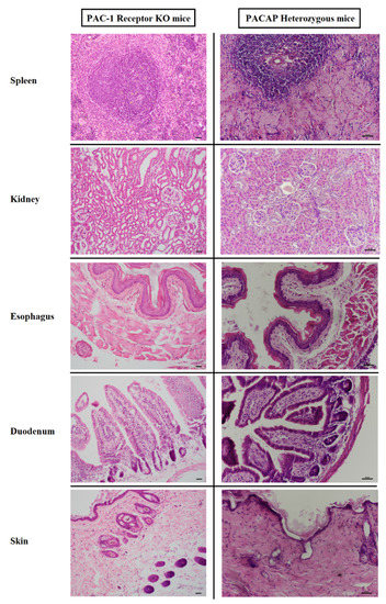 In contrast to the PACAP-deficient mice, PAC1 receptor-deficient animals showed no sign of amyloid deposits. Screening through all organs did not find any sign of amyloidosis in either young or aging individuals; all organs had a normal structure (Figure 1).