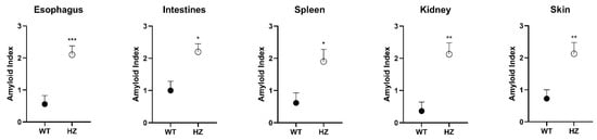 Our histological results in PACAP HZ mice matched those described earlier in homozygous PACAP KO mice [28]. Amyloid deposits appeared at an early age and were more widespread in mice partially lacking PACAP compared to WTs. Most severely affected organs were spleen, intestines, esophagus, kidney, and skin (Figure 1). Amyloid scores in the esophagus, intestines, spleen, kidney, and skin were markedly and significantly higher in the HZ animals compared to WTs (Figure 2).