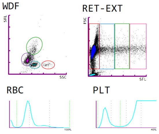 Representative blood count results from a HZ mouse. WDF: white blood cell differential; upper (green) cloud: monocytes, lower left (purple) cloud: lymphocytes, lower middle (blue) cloud: neutrophilic granulocytes, lower right (red) cloud: eosinophilic granulocytes. RET: reticulocytes and mature red blood cells, with the least differentiated reticulocytes in the right quartile, and mature red blood cells in the left quartile. Lower panels show representative red blood cell (RBC) and platelet (PLT) distribution width histograms.