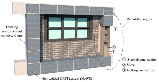 The NoWS system is a method of bolting CFSTs to the exterior of existing RC beams and columns, as shown in Figure 1. The CFST members consist of steel channels installed in existing frames and filled with mortar. Their structural and seismic performance are excellent, and construction costs can be reduced because additional formwork is not necessary. Steel channels and connections used in the NoWS system are prefabricated, and existing structural members are not removed. Therefore, installing CFST members is quick and easy, while the needs of workers are reduced. In addition, this method minimizes damage to structural members.