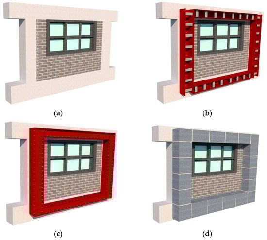 Retrofitting procedure using the NoWS system. (a) Cleaning the surface of the existing RC frame; (b) attaching the C-shaped steel channel to the surface; (c) bolting between the steel channel and cover; (d) and finishing off the retrofitted surface.