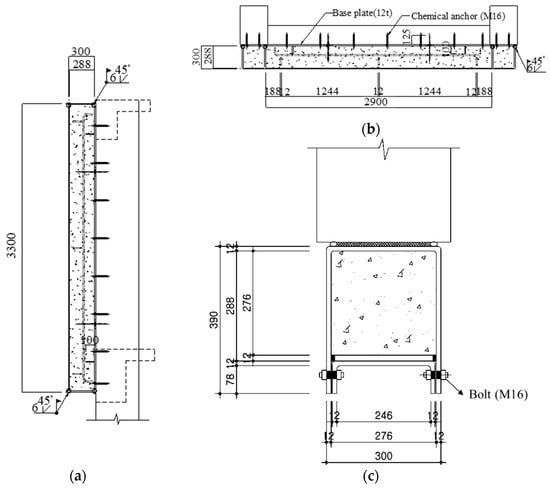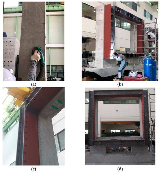 When connecting between steel members, welding and bolted connections are generally used. The most important characteristic of the NoWS system is the use of bolts to join the members. Welding can reduce the usage of steels, exhibits strong connections, and there are no openings such as bolt-holes. However, welding is not the preferred method, especially on-site due to low productivity and the need for skilled workers [20]. In addition, conventional welded connections present difficulties with quality assurance, and connections can be detached under large deformations [21,22,23]. The NoWS system uses bolts to join the members; therefore, it can maintain constant quality regardless of the efficiency of the worker, and its additional advantages are the shorter construction period and lower cost. The construction procedure of retrofitting using the NoWS system is shown in Figure 2. First, the surface of an existing RC frame is cleaned (Figure 2a) and C-shaped steel channels are attached to surface using chemical anchors. The steel channels and covers are bolted together (Figure 2b) and mortar is injected. The cover is bolted on (Figure 2c) and the retrofitted surface is finished off (Figure 2d).