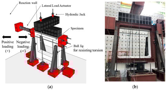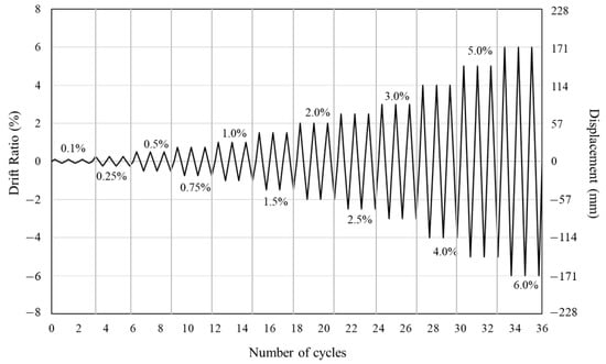 Each specimen was set up as shown in Figure 7. A hydraulic actuator with a maximum load of 2000 kN was installed between the reaction wall and the specimen. To apply load in the negative direction, a jig with a steel rod was attached to the loading surface on the opposite side of the actuator. To resist torsion caused by lateral load, a ball jig was set in the middle of the column. The loading method was referenced to the load protocol given in ACI 374.1 [25], which states that the initial drift ratio should be within the range to confirm the linear elastic behavior, the subsequent drift ratio should not exceed 0.25%, and the subsequent step should not be too large or too small. The loading should be repeated three times for each drift ratio. In this experiment, the loading was repeated three times for each drift ratio, as shown in Figure 8, and the drift ratio was set to increase gradually from 0.1% to 6%, which was 171 mm in deformation. In order to take into account the loading conditions of the benchmark structure shown in Figure 3, a 500 kN axial force was loaded onto both columns, each using a hydraulic jack with a maximum load of 1000 kN; the allowable load of the school suggested by the Korean Design Standards [26] was considered as the axial load. To measure the deformation of the reinforcements, concrete, and CFST frame when the lateral load was applied to the specimen, strain gauges were located in the columns, as shown in Figure 9.