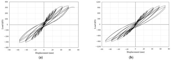 (2) In ERC and NoWS specimens, the applied lateral loads reached maximums of 332 kN and 924.32 kN in the positive direction, respectively, and −314.2 kN and −863.17 kN in the negative direction, respectively. This confirmed that retrofitting with the NoWS system increased the resistance to lateral loads by approximately three times compared to the ERC. The NoWS system can therefore be considered an effective seismic retrofit method for increasing the strength of existing RC frames.