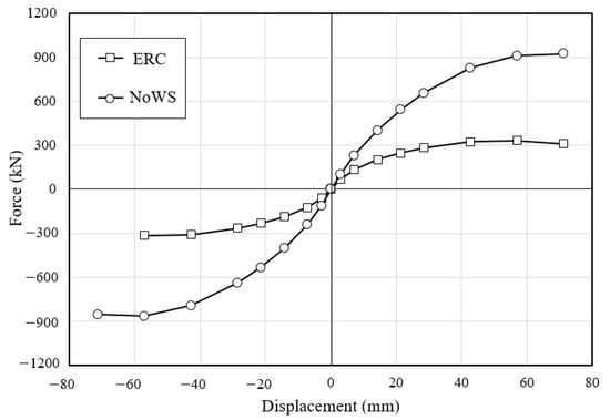 Figure 10 illustrates the hysteresis loops, and Figure 11 shows envelope curves of each specimen under cyclic loading. In the ERC specimen, the applied lateral load reached a maximum load of 322 kN, and in the negative direction, the load reached 314.2 kN at a drift ratio of 2%. After that, the load was reduced with progressing shear cracks and exhibited concrete spalling. In the first cycle of a 2.5% drift ratio in the positive direction, the maximum load was decreased to 311.4 kN and the experiment was terminated. In the initial drift ratio, the load-bearing capacity of the NoWS specimen was 1.7 times greater than that of the ERC specimen, and this gradually increased according to the drift ratio. At the 2% drift ratio, when the experiment on the ERC specimen ended due to shear failure, the resistance of the NoWS specimen was 2.7 times greater than that of the ERC specimen. In the NoWS specimens, the experiment was terminated at a 2.5% drift ratio, and the load was 924.32 kN in the positive direction and 853.61 kN in the negative direction. This confirmed that the proposed seismic retrofit method effectively enhanced the strength of the existing RC structure. According to results from previous research, the load-bearing capacities of the specimen using welding were 1.9 times greater initially and 2.8 times greater when the experiment terminated than those of the existing RC structure [24]. It was demonstrated that there was no difference in structural performance between welding and bolting connections. Table 4 summarizes the experimental results.
