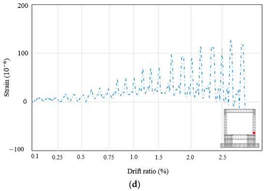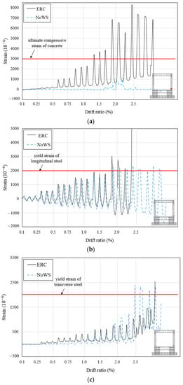 The strain at the end of each column measured by the cyclic loading tests is presented in Figure 12. In Figure 12, the horizontal lines show the ultimate compressive strain or yield strain. When initial cracks were formed at the end of the column, the concrete strain reached the ultimate compressive strain of 0.003. However, the NoWS specimen did not exceed the ultimate compressive strain, because the CFST frame absorbed seismic energy. The longitudinal steel and hoop in the columns of both specimens yielded drift ratios of 1.5% and 2%, respectively. In the NoWS specimen, the strain increased gradually after the yield of the rebar, but in the ERC specimen, the strain of the rebar and hoop increased rapidly in the third cycle of the 2% drift ratio. In the ERC specimen, deformation in the rebar and hoop was significant progress, because the concrete exceeded the ultimate compressive strain. The strain of the CFST was less than 10% of the yield strain of 0.001375, which was considered to cause little deformation of the CFST.