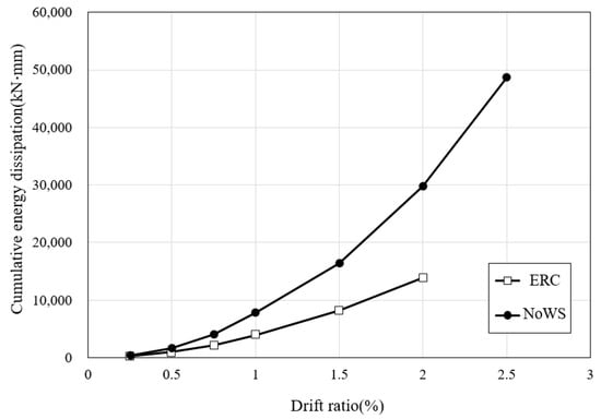Energy dissipation capability is a fundamental value to assess seismic resistance capacity, it being a structure’s ability to absorb seismic energy. The energy dissipation capacity is evaluated as the sum of the areas in the load–displacement curve of the specimen. The energy dissipation capability for each specimen is shown in Table 6. Figure 14 shows the difference between the energy dissipation capacities at previous drift ratios. The ERC specimen showed an energy dissipation of 190.49 kN∙mm with a drift ratio of 0.1%, which increased by about eighteen times at the 0.75% drift ratio to 3575.80 kN∙mm. The NoWS specimen also increased, by about twenty times, from 324.47 kN∙mm to 6423.29 kN∙mm. The reason for the large increase in energy dissipation from the 0.75% drift ratio for both specimens was that the amount of seismic energy dissipated by the structure surged because initial cracks were observed at the drift ratio of 1%. For the NoWS specimen, the energy dissipation was 1.7 times greater at the 0.1% drift ratio compared to the ERC, and this gradually and steadily increased to about 2.5 times greater at the drift ratio of 2%. This confirmed that the NoWS system was effective in improving seismic performance by significantly dissipating the seismic energy compared to the existing RC frame. These results were very similar to the results of previous studies which dealt with welded connection [24]; it indicated that the NoWS system was connected well without bolt loosening.