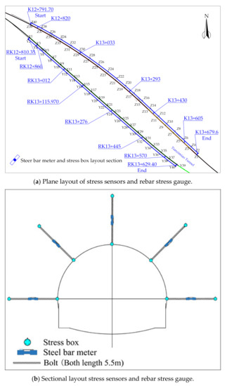 Layout of stress sensors and rebar stress gauge in tunnel.