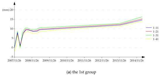 According to the observational data, as of 9 March 2015, the bedrock marker subsidence was relatively uniform compared with the datum point subsidence, and the subsidence was generally smaller in the southeast and larger in the northwest (Figure 8).