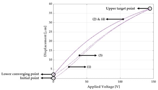 Taking into account the previous analysis, we designed the reference considering the applied voltage in the PEA. As a first consideration, the initial point within the first ascending curve is negligible to evaluate the performance of the PEA in a long-term experiment. Therefore, we outlined a reference between the lower converging and upper target point as linear Equation (1) reflects. In this mathematical expression, we defined X as the displacement, the slope between the two points of interests and b the vertical offset in terms of the lower converging point.