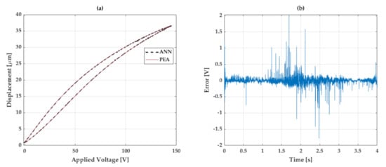 Ability of the ANN to fit to the PEA nonlinearity, where: (a) is the hysteresis graph contrast and (b) the error of the fitting.