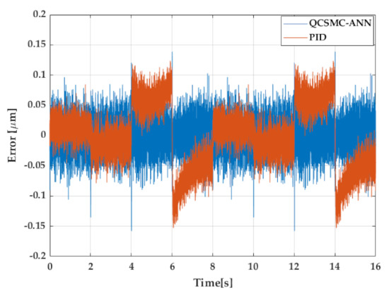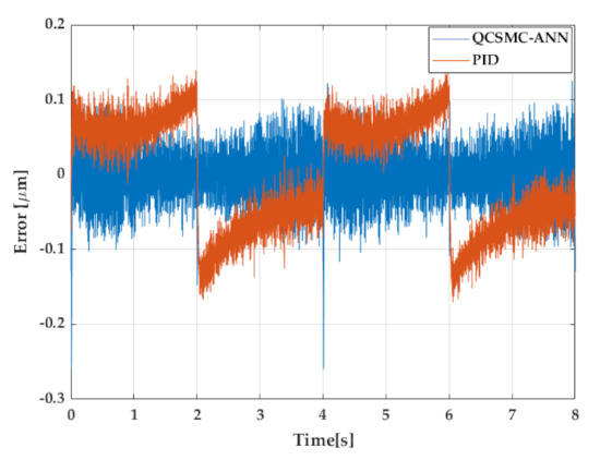 The first contract was performed with a triangular wave due to its complexity to be followed. Figure 6 presents the error obtained with the QCSMC-ANN and PID in triangular cycles where several points can be highlighted. The PID controller had a variable performance since between 0 and 1 s, the error declined; however, in the following second, the error began to rise up until 2 s. Despite the QCSMC-ANN providing a high amplitude in the first second of this period, in the following, it was diminished.