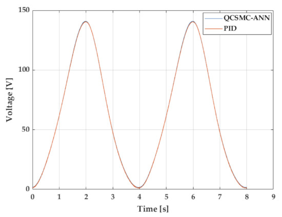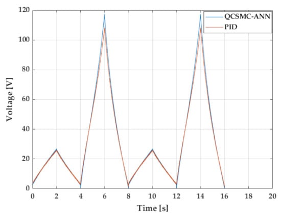 Another experiment performed is the triangular reference signal with variable amplitudes that were settled randomly in 25 V and 121 V. Figure 10 shows the repercussions of the error for the considered reference. During the first 4 s, where the amplitude was 25 V, both controllers had a similar demeanour. The PID shows a perceptible shift at the upper target point in 2 s; however, the QCSMC-ANN provided a constant development along this range with the same deviation as the PID. On the other hand, the major difference can be noticeable during 121 V, where the PID behaves similarly to previously analysed triangular signals where fast corrections occur during the slope changes of the reference signal. This effect produced a brief increment of the error amplitude in the analysed controllers, but the QCSMC-ANN managed to carry this without any transients, a feature produced by the PID.