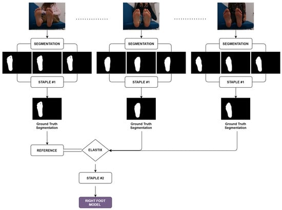 A foot model was extracted for each gender and foot separately, employing all the images previously acquired. For simplicity, the procedure to extract the right foot model is described but an analogous procedure was employed for the left foot. The method consisted in selecting one of the images as a reference or fixed image, and subsequently registering, by an affine transformation, the remaining ones to that reference. A simplified scheme describing the workflow employed is presented in Figure 1.