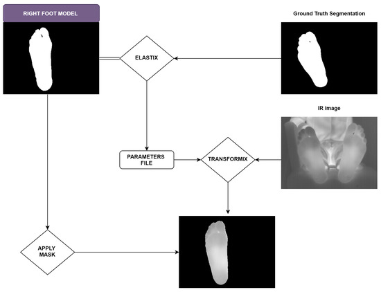 Once the final right foot model was established as global reference, based on the overlap measures, the ground truth segmentations associated with each subject were subsequently registered to this model by another affine transformation. All these spatial transformations were also carried out using the SimpleElastix module [] in Python 3 []. Since, as previously ensured, RGB-D-IR images were in the same coordinate system, the same affine transformation used for each segmentation mask was applied to the corresponding RGB-D and IR images using the Transformix module [,] in Python 3 []. That is, the file of parameters corresponding to each registration was employed in the Transformix module to bring the IR image to the reference model. Finally, the foot model was applied to the transformed IR image. A simplified scheme of the workflow is presented in Figure 2.