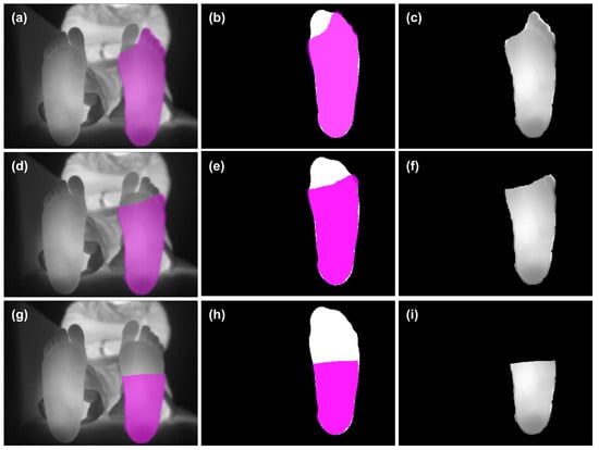 Three different configurations for partial foot amputation are displayed; each row corresponds to the same case and each column to the subsequent steps within the workflow described in Figure 2. The first column, (a,d,g), displays the original IR images and the overlapped segmentation (pink mask) in which various degrees of partial foot amputations have been simulated. The second column, (b,e,h), shows the simulated segmentation (pink mask) registered to and overlapped with the corresponding left foot model. The third column, (c,f,i), illustrates the final result where the simulated segmentation is applied to the original IR image for further processing.