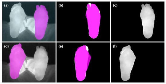 Male subject with variable degree of deformation in both feet. The upper row illustrates the workflow described in Figure 2 for the left foot whereas the lower one corresponds to the right foot. The first column, (a,d), displays the original IR images and the corresponding segmentation (pink mask). The second column, (b,e), shows the segmentation registered to and overlapped with the left and right models, respectively. The third column, (c,f), illustrates the final result in which the segmentation is applied to the original IR image for further processing.