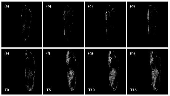 Statistically significant p values map, for each gender, at each time point, T0, T5, T10 and T15. The upper row corresponds to the female subjects (a–d), whereas the lower to the male subjects, (e–h), respectively.