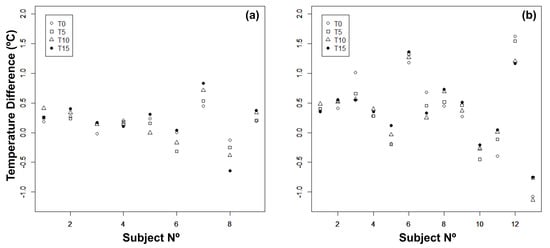 As can be noticed, the mean temperature difference is larger for the male group as compared to the female, although not statistical significance was detected according to Wilcoxon’s test. Furthermore, the largest temperature difference for the female group of subjects was around 0.8 °C at T15, whereas for the male group, the largest difference was 1.6 °C at T0. In order to facilitate the visualization of the changes observed, the individual temperature differences at each time point are plotted in Figure 8. For some individuals in both groups, negative values were detected, this indicates that the right foot was hotter than the left one.