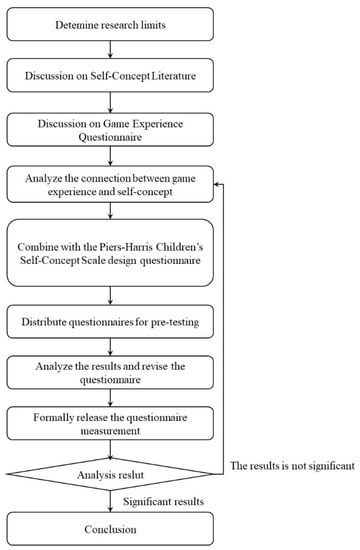 This research uses a questionnaire survey method to collect information to understand the current situation of the smartphone gaming experience and self-concept of middle-grade students in elementary school. After the questionnaire is designed, a pre-test is conducted to test the reliability and validity of the questionnaire and collect feedback from the subjects to modify its content. One month after the end of the pre-test, the questionnaire is formally distributed for measurement, following which the results are analyzed. If no significant difference is found, the correlation between gaming experience and self-concept is re-analyzed; if there is a significant difference, it is summarized based on the analysis results to draw conclusions and make recommendations. The research framework is shown in Figure 1.