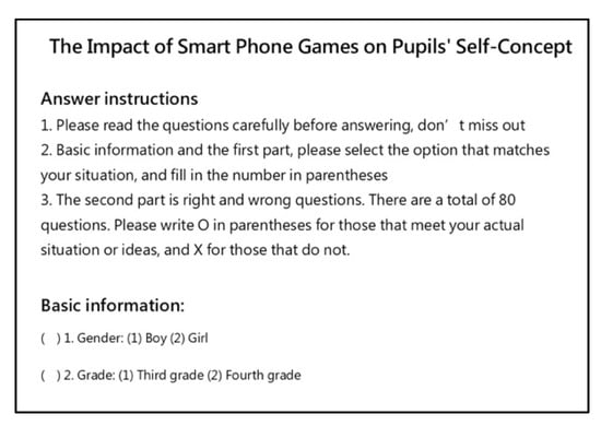 Two questionnaires were used in this study—the Smartphone Game Experience and the Piers-Harris Children’s Self-Concept Scale. The former refers to the Online Game Experience Questionnaire compiled by Xinjie Wu []. The content of the test changed from online games to smartphone games, and some content was modified to obtain a smartphone gaming experience questionnaire, including time spent on smartphone games, and frequency of play on weekdays and weekends. The questionnaire used to understand self-concept is the Piers-Harris Children’s Self-Concept Scale.