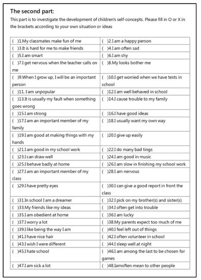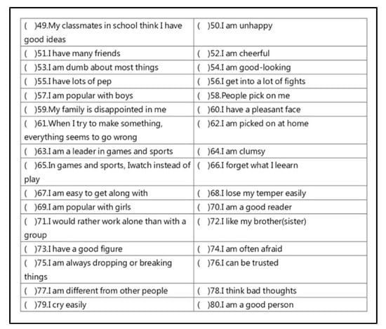 The Piers-Harris Children’s Self-Concept Scale was revised in 1974 to evaluate children’s self-concept status []. The Chinese version of this scale was introduced and translated by scholar Wang Mengxin. This scale contains 80 true and false questions and is suitable for children aged 8–16. It is divided into six subscales, namely Behavioral Adjustment, Intellectual and School Status, Physical Appearance and Attributes, Freedom from Anxiety, Popularity, and Happiness and Satisfaction; the total score is calculated from the six subscales. The children fill in the answer sheet by themselves. The higher the scale, the better the evaluation. The Chinese part refers to a translation by scholar Wang Tangyi in 2012 in A Study on the Reliability and Validity of the Piers-Harris Children’s Self-Concept Scale with Learning Disabilities in Elementary Schools [].