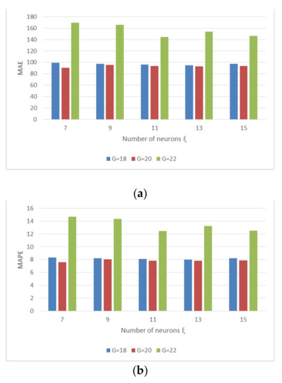 In Figure 9, we generally obtain better job cycle time prediction performance (MAE) with the threshold values . These threshold values provide good data classification that improves the job cycle time prediction accuracy in the BPN predictor. Similar trends are obtained for the MAPE and RMSE values in Figure 10 and Figure 11, respectively.