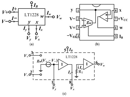 Each of the isomorphic circuits’ symbols of an LT1228 commercial IC from Linear Technology [25] is shown in Figure 1a, and its packed IC is shown Figure 1b. The LT1228 IC contains an OTA with a specially devised CFA. Figure 1c shows the equivalent circuit of the LT1228 IC, and the ideal port relations of LT1228 can be characterized by the following hybrid matrix [23]: