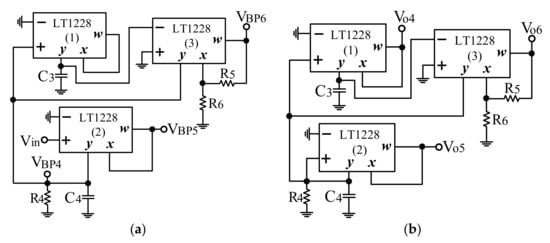 where VDD is the positive voltage supply and VEE is the negative voltage supply. VBE is a bias voltage of the bipolar junction transistor and is approximately equal to 0.65 volts. RB is a bias control resistor used to obtain the DC bias current IB. The proposed two isomorphic circuits are shown in Figure 2 and Figure 3. Each of the circuits contains three LT1228 commercial ICs, two grounded capacitors, two grounded resistors and one floating resistor. The use of grounded capacitors is beneficial for the implementation of the IC. Each input voltage of the VM NBPF (Figure 2a and Figure 3a) is applied to the positive voltage terminal of the LT1228, so it has a high-input impedance and can be easily cascaded without any voltage buffers. The output impedances of terminals VBP2 and VBP5 (Figure 2a and Figure 3a, respectively) are very small, so they can also be directly connected to the next stage without any voltage buffers. Moreover, the VM NBPF responses of VBP3 and VBP6 shown in Figure 2a and Figure 3a, respectively, can achieve a wide range of independent amplitude adjustable passband gains without affecting the parameters of fo and Q.