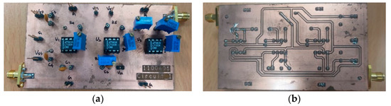 The proposed isomorphic circuits of the VM NBPFs and VM QSOs were simulated with Cadence OrCAD PSpice simulation software version 16.6 to confirm the theory and implemented by three off-the-shelf LT1228 ICs, two grounded capacitors and three resistors to verify the performance of the isomorphic circuits. The isomorphic circuits adopted a DC bias of ±5 V for the voltage supplies, and the voltage output was measured in the time domain with a Tektronix DPO 2048B oscilloscope, the voltage output was measured in the frequency domain with a Keysight E5061B-3L5 network analyzer, and the voltage output in the frequency spectrum was measured with a Keysight-Agilent N9000A CXA signal analyzer. The measurement photos of the isomorphic circuits are shown in Figure 4 and Figure 5.