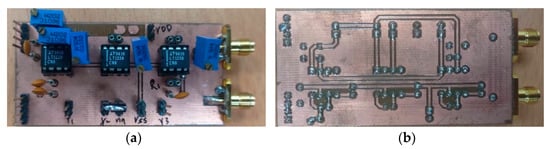 where gm is the transconductance gain of the LT1228 IC and RT is the transresistance gain of the CFA. Ideally, RT approaches infinity, and the gm is controlled by the direct current (DC) bias current (IB) of LT1228. The gm value is equal to 10 times the value of IB and can be expressed as [23,25]