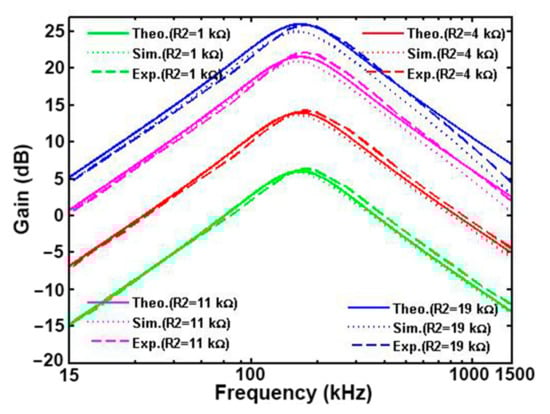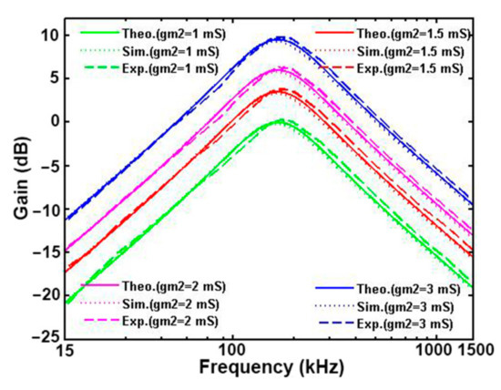 The theoretical, simulated and measured NBPF responses of VBP2 and VBP3 (Figure 2a) are shown in Figure 6 and Figure 7, respectively, as depicted in Equations (11) and (12). In Figure 6, the NBPF voltage gain at the voltage output of VBP2 could be adjusted independently by gm2 without affecting parameters fo and Q, as depicted in Equations (13)–(15). In Figure 7, the wide range of independent amplitude adjustable NBPF voltage gain at the voltage output of VBP3 could also be independently adjusted by R2 without affecting the NBPF parameters fo and Q, as depicted in Equations (13), (14) and (16). The component values used in Figure 6 were C1 = C2 = 0.96 nF, gm1 = gm3 = 1 mS and R1 = R2 = R3 = 1 kΩ for the theoretical value of fo = 165.8 kHz, and only gm2 changed, with different values of 1, 1.5, 2 and 3 mS. This resulted in an NBPF at a voltage output of VBP2 with voltage gains of 0, 3.52, 6.02 and 9.54 dB. Figure 8 shows the measurement results of the VBP2 gain response. The component values used in Figure 7 were C1 = C2 = 0.96 nF, gm1 = gm2 = gm3 = 1 mS and R1 = R3 = 1 kΩ for a theoretical value of fo = 165.8 kHz, and only R2 changed, with different values of 1, 4, 11 and 19 kΩ. This resulted in an NBPF at a voltage output of VBP3 with voltage gains of 6.02, 13.98, 21.58 and 26 dB. Figure 9 shows the measurement results of the VBP3 gain response. To display the independent electronically adjusted passband gains from Figure 2a, the value of gm2 was changed from 1 mS to 4 mS, and the NBPF voltage gain at the voltage output of VBP2 could be changed from 0 dB to 12.04 dB. As shown in Figure 10, the proposed NBPF in Figure 2a exhibited independent electronic adjustment of passband gains at the voltage output of VBP2. To display the maximum operating passband gains of Figure 2a, the value of R2 was changed from 1 kΩ to 25 kΩ, and the NBPF voltage gain at the voltage output of VBP3 could be changed from 6.02 dB to 28.3 dB. As is shown in Figure 11, the proposed NBPF from Figure 2a exhibited a wide range of independent amplitude adjustable passbands at a voltage output of VBP3. Figure 12 shows the theoretical, simulated and measured NBPF responses on the VBP2 output terminal with different values of R1 when C1 = C2 = 0.96 nF, R2 = R3 = 1 kΩ and gm1 = gm2 = gm3 = 1 mS. Figure 13 shows the measurement results of the VBP2 gain response with different Q values. In this case, the four values of R1 were changed to 1, 1.5, 2 and 3 kΩ, and the measured values of Q were 1.17, 1.53, 2.08 and 3. As shown in Figure 12 and Figure 13, the Q parameter of the NBPF could be independently controlled by adjusting the different values of R1 without affecting the parameters of fo, as depicted in Equations (13) and (14). For an experimental test, Figure 14 shows the input and output voltage waveforms of the NBPF response at the VBP2 output terminal, which could be extended to an amplitude of 120 mVpp without signification distortion. As shown in Figure 14, the input voltage waveform was a 165.8-kHz sinusoidal waveform, and the output voltage waveform was measured to be a 161.7-kHz sinusoidal waveform with a phase difference of 0.23°.