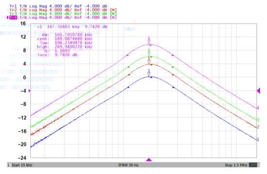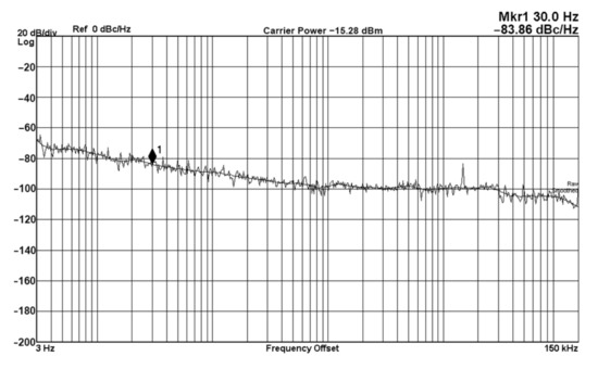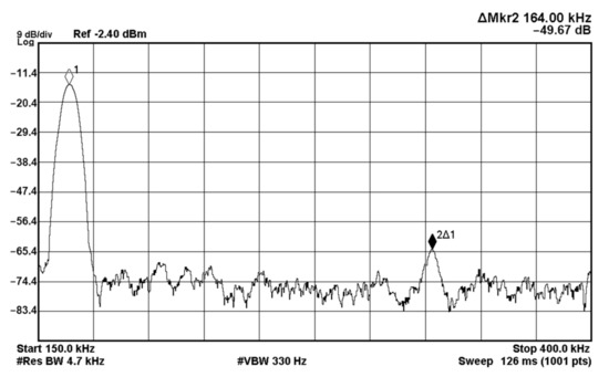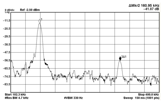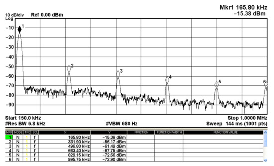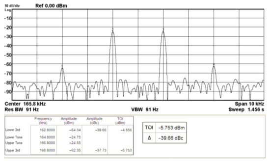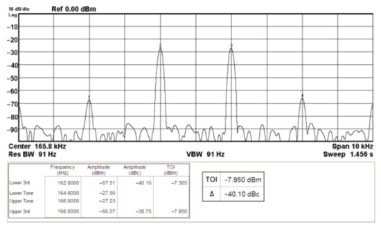 where p(f2 ± (n − 1))f1 is the root mean square value of the nth-order intermodulation component at the sum and difference of the two tones and p(f2) is the root mean square value of the fundamental component at the excitation frequency f2. Figure 15 shows the frequency spectrum of the NBPF response at the VBP2 output terminal. The NBPF response center frequency measured at the output of VBP2 was about 165.8 kHz. The THD, including the fundamental harmonic through the sixth harmonic components of Figure 15, was about 1.08%. Figure 16 shows the THD result of the NBPF response at the VBP2 output terminal with different input voltages by keeping a constant center frequency of 165.8 kHz. Figure 17 shows the spectrum of the NBPF at the output of VBP2, which was obtained by applying two-tone signals f1 and f2 around the theoretical value of fo = 165.8 kHz for IMD characterization. In Figure 17, the low-frequency tones of f1 = 164.8 kHz and the high-frequency tones of f2 = 166.8 kHz were used with an input amplitude of 63 mVpp. The measured value of the third-order IMD (IMD3) was about −40.1 dBc, and the third-order intercept (TOI) was about −7.95 dBm. Figure 18 shows the 1-dB compression point (P1dB) of the NBPF measured at the output of VBP2 between the output power and the input power when the center frequency was 165.8 kHz. The measured output power P1dB was about −11.4 dBm. Figure 19 shows the phase noise performance of the NBPF measured at the output of VBP2. The measured value of the phase noise of VBP2 was less than −83.86 dBc/Hz at a 30-Hz offset.