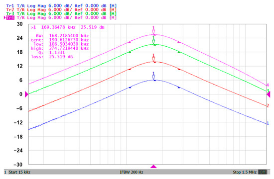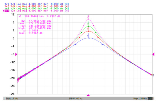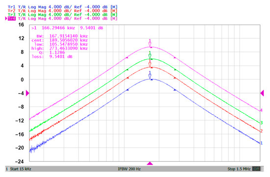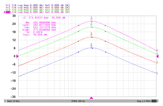 The theoretical, simulated and measured NBPF responses of the VBP5 and VBP6 (Figure 3a) are shown in Figure 27 and Figure 28, respectively, as depicted in Equations (26) and (27). In Figure 27, the NBPF voltage gain at the voltage output of VBP5 could be adjusted independently by gm2 without affecting the parameters fo and Q as depicted in Equations (28)–(30). In Figure 28, the wide range of the independent amplitude adjustable NBPF voltage gain at the voltage output of VBP6 could also be independently adjusted by R5 without affecting the NBPF parameters fo and Q as depicted in Equations (28), (29) and (31). The component values used in Figure 27 were C3 = C4 = 0.96 nF, gm1 = gm3 = 1 mS and R4 = R5 = R6 = 1 kΩ for the theoretical value of fo = 165.8 kHz, and only gm2 changed, with different values of 1, 1.5, 2 and 3 mS. This resulted in an NBPF at a voltage output of VBP5 with voltage gains of 0, 3.52, 6.02 and 9.54 dB. Figure 29 shows the measurement results of the VBP5 gain response. The component values used in Figure 28 were C3 = C4 = 0.96 nF, gm1 = gm2 = gm3 = 1 mS and R4 = R6 = 1 kΩ for a theoretical value of fo = 165.8 kHz, and only R5 changed, with different values of 1, 4, 11 and 19 kΩ. This resulted in an NBPF at a voltage output of VBP6 with voltage gains of 6.12, 13.9, 21.3 and 25.52 dB. Figure 30 shows the measurement results of the VBP6 gain response. To display the independent electronically adjusted passband gains from Figure 3a, the value of gm2 was changed from 1 mS to 4 mS, and the NBPF voltage gain at the voltage output of VBP5 could be changed from 0 dB to 12.04 dB. As is shown in Figure 31, the proposed NBPF from Figure 3a exhibited independent electronic adjustment of the passband gains at a voltage output of VBP5. To display the maximum operating passband gains from Figure 3a, the value of R5 was changed from 1 kΩ to 25 kΩ, and the NBPF voltage gain at the voltage output of VBP6 could be changed from 6.02 dB to 28.3 dB. As is shown in Figure 32, the proposed NBPF from Figure 3a exhibited a wide range of independent amplitude adjustable passbands at the voltage output of VBP6. Figure 33 shows the theoretical, simulated and measured NBPF responses on the VBP5 output terminal with different values of R4 when C3 = C4 = 0.96 nF, R5 = R6 = 1 kΩ and gm1 = gm2 = gm3 = 1 mS. Figure 34 shows the measurement results of the VBP5 gain response with different Q values. In this case, the four values of R4 were changed to 1, 1.5, 2 and 3 kΩ, and the measured values of Q were 1.14, 1.59, 2.06 and 2.98, respectively. As is shown in Figure 33 and Figure 34, the Q parameter of the NBPF could be independently controlled by adjusting the different values of R4 without affecting the parameters of fo, as depicted in Equations (28) and (29). For the experimental test, Figure 35 shows the input and output voltage waveforms of the NBPF response at the VBP5 output terminal, which could be extended to an amplitude of 120 mVpp without signification distortion. As shown in Figure 35, the input voltage waveform was a 165.8-kHz sinusoidal waveform, and the output voltage waveform was measured as a 165.8-kHz sinusoidal waveform with a phase difference of 0.57°. Figure 36 shows the frequency spectrum of the NBPF response at the VBP5 output terminal. The NBPF response center frequency measured at the output of VBP5 was 165.8 kHz. The THD, including the fundamental harmonic through the sixth harmonic components of Figure 36, was about 1.12%. Figure 37 shows the THD result of the NBPF response at the VBP5 output terminal with different input voltages while keeping a constant center frequency of 165.8 kHz. Figure 38 shows the spectrum of the NBPF at the output of VBP5, which was obtained by applying two-tone signals f1 and f2 around the theoretical value of fo = 165.8 kHz for IMD characterization. In Figure 38, the low-frequency tones of f1 = 164.8 kHz and the high-frequency tones of f2 = 166.8 kHz were used with input amplitudes of 63 mVpp. The measured value of the IMD3 was about −39.66 dBc, and the TOI was about −5.753 dBm. Figure 39 shows the P1dB of the NBPF measured at the output of VBP5 between the output power and the input power when the center frequency was 165.8 kHz. The measured output power P1dB was about −9.77 dBm. Figure 40 shows the phase noise performance of the NBPF measured at the output of VBP5. The measured value of the phase noise of VBP5 was less than −73.87 dBc/Hz at a 30-Hz offset. According to the NBPF frequency spectrum measured in Figure 36, the dynamic range between the fundamental tone and the largest spurious of the spurious-free dynamic range was approximately 40.86 dB. Thus, the FoM of the proposed VM NBPF at the voltage output of VBP5 was approximately computed to be 3.08 × 106.