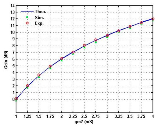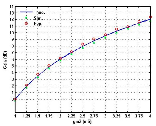 The theoretical, simulated and measured NBPF responses at the voltage output of VBP2 when gm2 was varied.