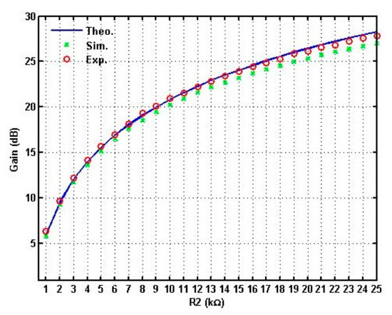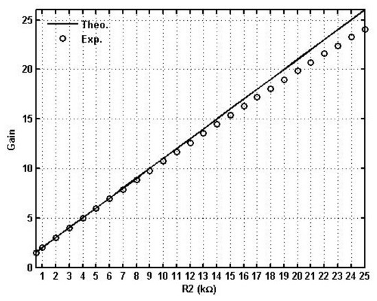 The experimental results of the Vo3 voltage gain when R2 was varied.